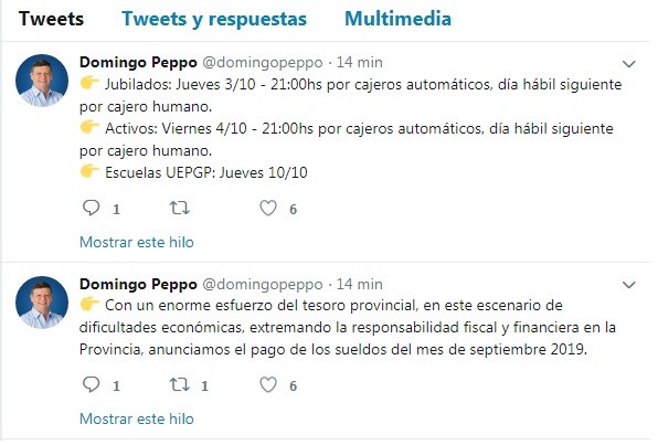 El gobernador Domingo Peppo anunció el cronograma de pagos de haberes correspondientes a septiembre para la Administración Pública Provincial. “Con un enorme esfuerzo del tesoro provincial, en este escenario de dificultades económicas, extremando la responsabilidad fiscal y financiera en la Provincia, anunciamos el pago de los sueldos del mes de septiembre 2019”, mencionó a través de redes sociales el mandatario.