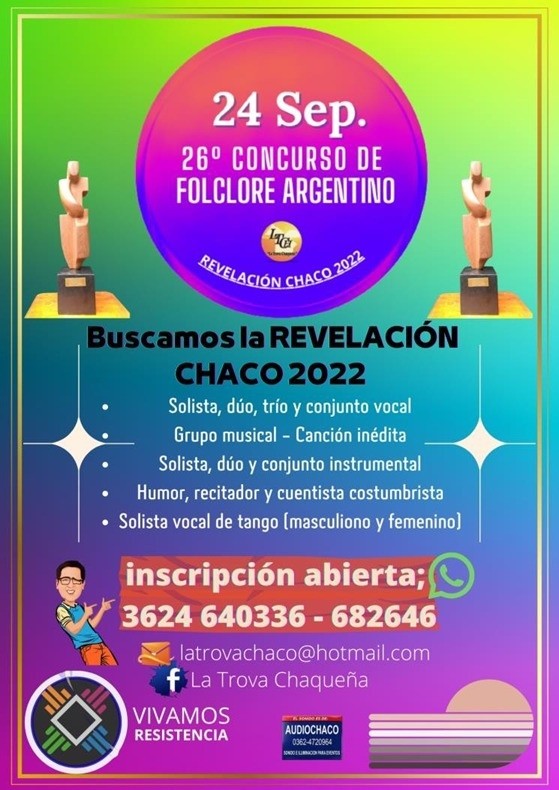 El día sábado 24 de septiembre se realizará en Resistencia Chaco la vigésima sexta edición del Concurso de Folclore Argentino en busca de la Revelación Chaco 2022.