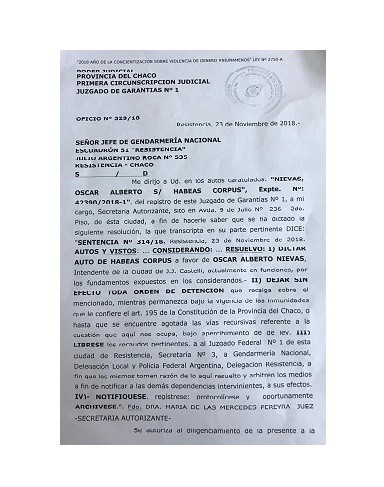 Mediante el cual determina “dejar sin efecto toda orden de detención que recaiga sobre el mencionado, mientras permanezca bajo la vigencia de la inmunidades que le confiere el Art. N° 195 de la Constitución de la Provincia del Chaco”. De esta forma, Nievas aguardará la siguiente instancia de apelación en libertad.   Para la juez Pereyra, no se estaría respetando el orden de prelación de las normas vigentes en el país, en este caso, de la Constitución de la Provincia del Chaco, al pretender que las imputaciones penales que recaen sobre Nievas estén por encima de la inmunidad de arresto que le otorga la Constitución provincial.   Nievas ya se había presentado a declarar ante Niremperger y también había solicitado licencia al Concejo Municipal para así garantizar que ante la eventualidad de su arresto la Legislatura provincial no apurara una intervención al municipio con el argumento de que éste estaba acéfalo. Por la noche, en sesión extraordinaria, el Concejo le otorgó la licencia sin goce de haberes hasta el 1 de marzo, y quedó a cargo de la intendencia el titular del cuerpo, Pío Sander.    Con esta resolución, Nievas deberá esperar en libertad a que la Cámara de Casación federal decida si el criterio de la Cámara de Apelaciones y el de los fiscales Sabadini y Carniel es correcto, o si era Niremperger quien tenía razón.