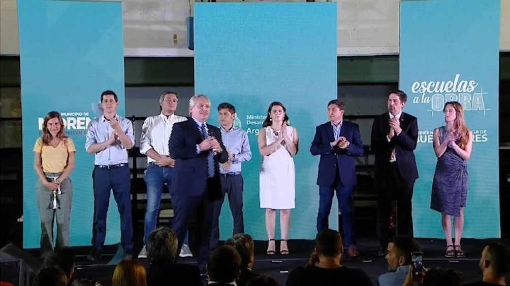 En el escenario, acompañaron a Fernández los ministros de Educación, Nicolás Trotta; Interior, Eduardo Wado De Pedro; y Desarrollo Social, Daniel Arroyo; el jefe del bloque de diputados nacionales del Frente de Todos, Máximo Kirchner; el gobernador de Buenos Aires, Axel Kicillof; la intendenta de Moreno, Mariel Fernández; la directora de Escuelas bonaerense, Agustina Ávila; y la ministra de Desarrollo de Buenos Aires, Fernanda Raverta.