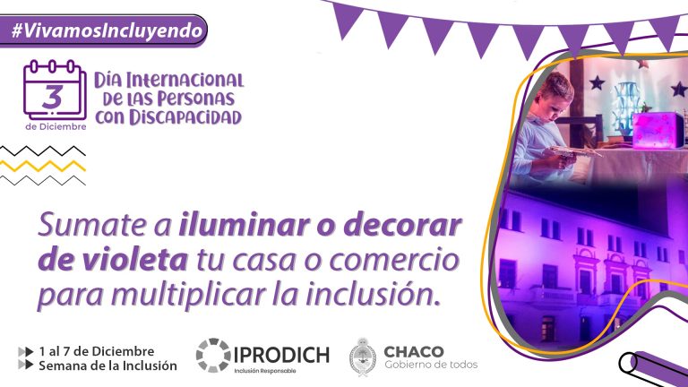 El Instituto Provincial para la Inclusión de las Personas con Discapacidad del Chaco (IPRODICH) invita a sumarse a la campaña #VivamosIncluyendo, para conmemorar el Día Internacional de las Personas con Discapacidad ( 3 de Diciembre). La iniciativa se desarrollará durante la semana del 1 al 7 de diciembre, teniendo como principales actividades la inauguración en la Terminal de Ómnibus de Resistencia de una “Boletería Única Accesible” para el colectivo de la discapacidad, y la convocatoria a edificios públicos, casas particulares y comercios, a iluminarse o decorar con color violeta el día en que se conmemora la jornada de la discapacidad. “En contexto de pandemia, buscamos seguir poniendo en agenda la discapacidad para tomar conciencia entre todos sobre la importancia de incluir día a día, desde cada lugar a las personas con discapacidad, la inclusión y accesibilidad debe darse transversalmente, desde lo social, económico, laboral, educacional, judicial, y otros tantos ámbitos”, remarcó el presidente del IPRODICH José Lorenzo. El 3 de diciembre, fecha en que se conmemora el Día de las Personas Con Discapacidad, se inaugurará en la Terminal de Resistencia una “Boletería Única Accesible” que permitirá a los chaqueños con discapacidad acceder a sus pasajes rápidamente y con atención personalizada. “Por primera vez Chaco contará con un espacio totalmente destinado a la venta de pasajes para personas con discapacidad que les brindará todas las comodidades y accesibilidad”, destacó. Además convocará a la sociedad, organismos públicos y comercios a iluminar o decorar con color violeta sus espacios físicos. “Elegimos el violeta para representar la discapacidad e inclusión, ya que este color entre sus distintos significados, representa el ‘poder’ y el mensaje que buscamos transmitir es que el día 3 de diciembre y todos los días deben ser de constante empoderamiento de las personas con discapacidad”, explicó Lorenzo. Del 1 al 7 de diciembre, en las redes sociales del organismo (@IPRODICH) se difundirán trivias y tips sobre discapacidad, y videos con experiencias de vidas de personas con discapacidad.