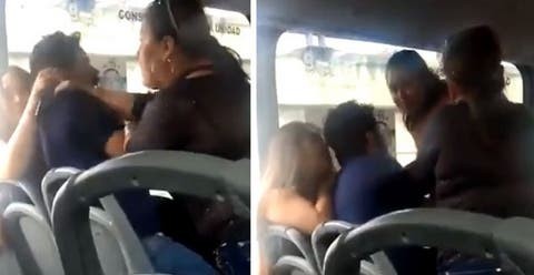 Un pasajero grabó con su teléfono celular el momento en que un hombre es encontrado in fraganti por su esposa y su suegra que se lo cruzaron a bordo de un transporte público y reaccionaron con violencia.