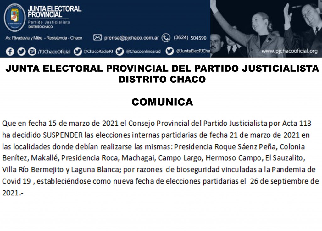 partidarias de fecha 21 de marzo de 2021 en las localidades donde debían realizarse las mismas: Presidencia Roque Sáenz Peña, Colonia Benítez, Makallé, Presidencia Roca, Machagai, Campo Largo, Hermoso Campo, El Sauzalito, Villa Río Bermejito y Laguna Blanca; por razones de bioseguridad vinculadas a la Pandemia de Covid 19 , estableciéndose como nueva fecha de elecciones partidarias el 26 de septiembre de 2021.-