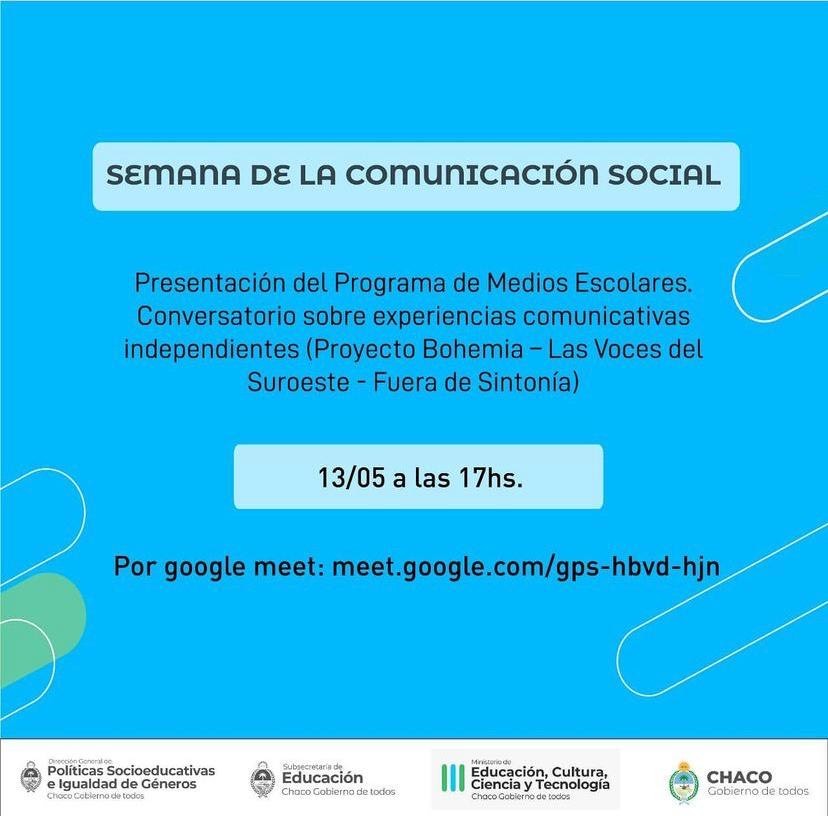 La presentación del programa se llevará a cabo el jueves 13 de mayo, a las 17 por Google Meet (http://meet.google.com/gps-hbvd-hjn) y será transmitido en vivo por el canal de YouTube de Políticas Socioeducativas (https://www.youtube.com/channel/UCoruSgzk5ZmI2KDbR07ciPA/featured). El Programa Medios Escolares está dirigido a estudiantes y docentes de las instituciones educativas del Chaco y tiene incluidos proyectos de comunicación audiovisual como radio, emisiones de streaming, medios gráficos, documentales, redes sociales y otros.