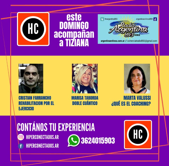 ¡En Hiperconectados, este Domingo acompañarán a Tiziana: Marisa Taborda hablará sobre el Doble Cuántico; Cristian Farrancho nos contará sobre la Rehabilitación por el Ejercicio; Marta Valussi nos visita para contarnos ¿Qué es el Coaching?
