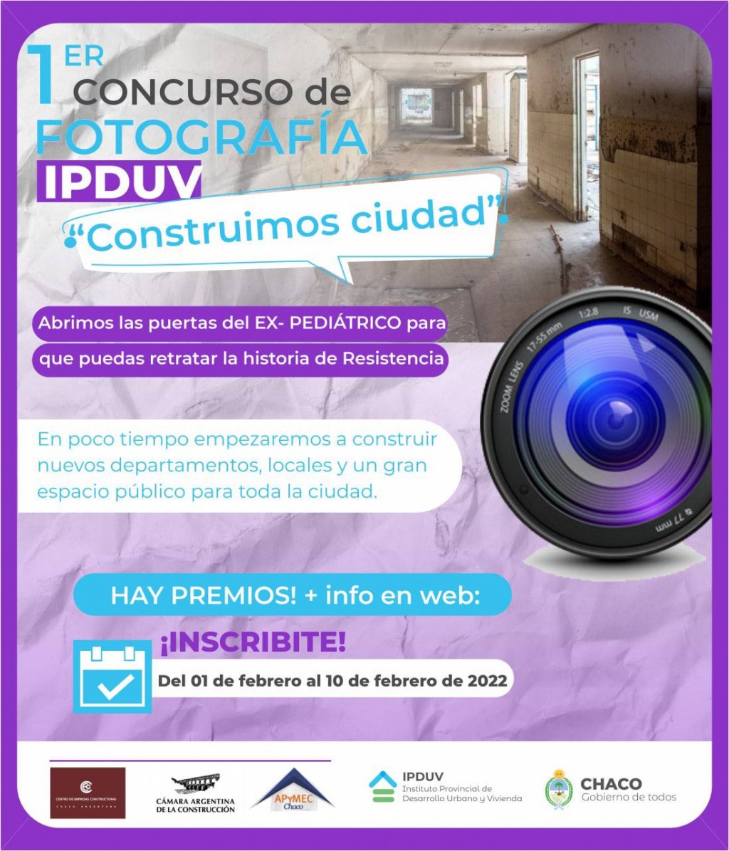El Instituto de Desarrollo Urbano y Vivienda (Ipduv), convoca a fotógrafos profesionales y aficionados a participar del primer concurso de fotografía “Construimos Ciudad”, el cual busca visibilizar el estado en el que se encuentra el emblemático predio del ex pediátrico antes de que se inicie la ejecución del edificio PROCREAR como así también el de la nueva sede del INSSSEP y el espacio público.