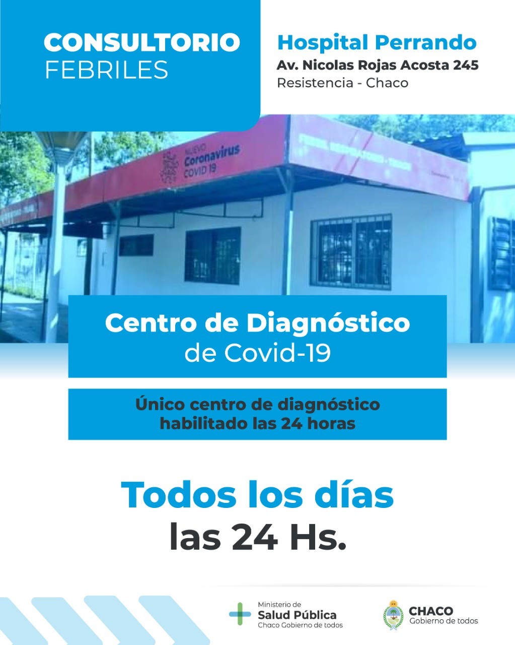 El Ministerio de Salud Pública informa a la población que, a partir del lunes 7 de febrero, el Centro de Diagnóstico de Covid-19 de la “Escuela Normal Sarmiento”, (Dónovan 425, de Resistencia), dejará de estar activa debido a la mejoría en los índices epidemiológicos y a la disminución en la demanda. Asimismo, se anuncia que el único Centro de Diagnóstico que funcionará durante las 24 horas será el que se encuentra en el Consultorio de Febriles del hospital “Julio. C Perrando” sobre la avenida Nicolás Rojas Acosta 245.