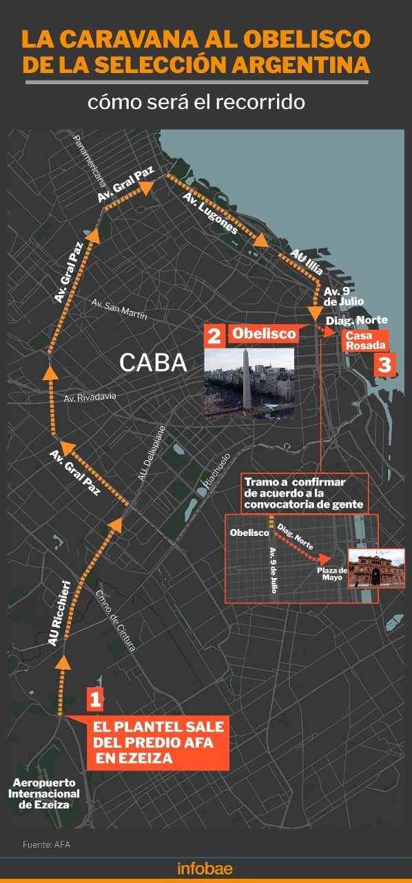 Según se acordó, desde ese lugar partirá el equipo para avanzar en dirección a la Autopista Ricchieri, para luego tomar la Avenida General Paz, continuar por Lugones hasta llegar a 9 de Julio y, de ahí, seguir viaje hacia el Obelisco, donde serán los festejos principales, para posteriormente comenzar su regreso, que será por la avenida la autopista 25 de Mayo, luego por Dellepiane, y la Ricchieri hasta regresar al predio de Ezeiza.