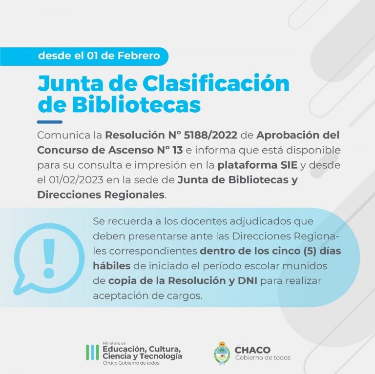 El Ministerio de Educación, a través de la Junta de Clasificación de Bibliotecas, comunica la Resolución Nº 5188/2022 de aprobación del Concurso de Ascenso Nº 13, e informa que está disponible para su consulta e impresión en la Plataforma SIE. También estará disponible desde el 01/02/2023 en la sede de Junta de Clasificación de Biblioteca y Direcciones Regionales.