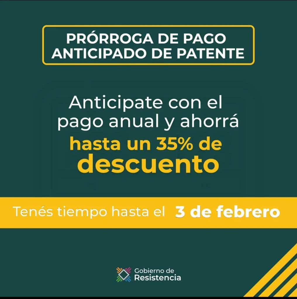 Resistencia recuerda que hasta este viernes 3 de febrero existe la posibilidad de acceder a los beneficios por el pago anual anticipado de la patente de vehículos. Con horarios tanto de mañana como por la tarde, el contribuyente dispone de varias alternativas para acogerse a este sistema que propone descuentos hasta el 35 por ciento.