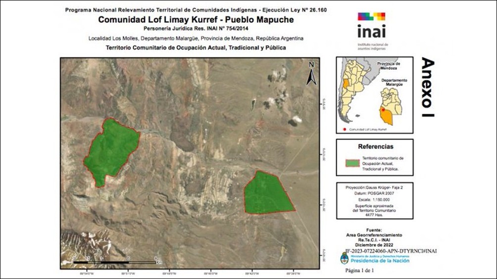De esa forma, según se precisa, "se da por cumplido el relevamiento técnico, jurÃdico y catastral dispuesto por el ArtÃculo 3° de la Ley Nacional Nº 26.160, Decreto PEN N°1122/07 y la Resolución INAI N° 587/07" en la Comunidad Lof Limay Kurref, perteneciente al Pueblo Mapuche, en Mendoza".