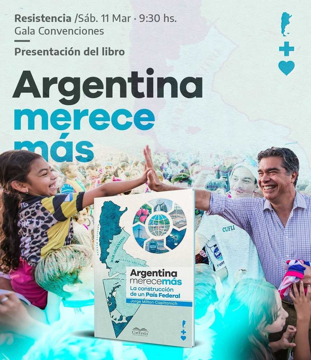 El gobernador Jorge Capitanich presentará su nueva obra literaria en Resistencia y Corrientes. Se trata del libro “Argentina Merece Más. La construcción de un país federal. El círculo virtuoso del desarrollo”, publicado por Editorial Contexto, el cual será exhibido en sociedad este 11 de marzo en ambas provincias del Nea. En Resistencia, desde las 9,30 en el Centro de Convenciones Gala y en la capital correntina a las 19 en el Aula Magna de la Facultad de Derecho.