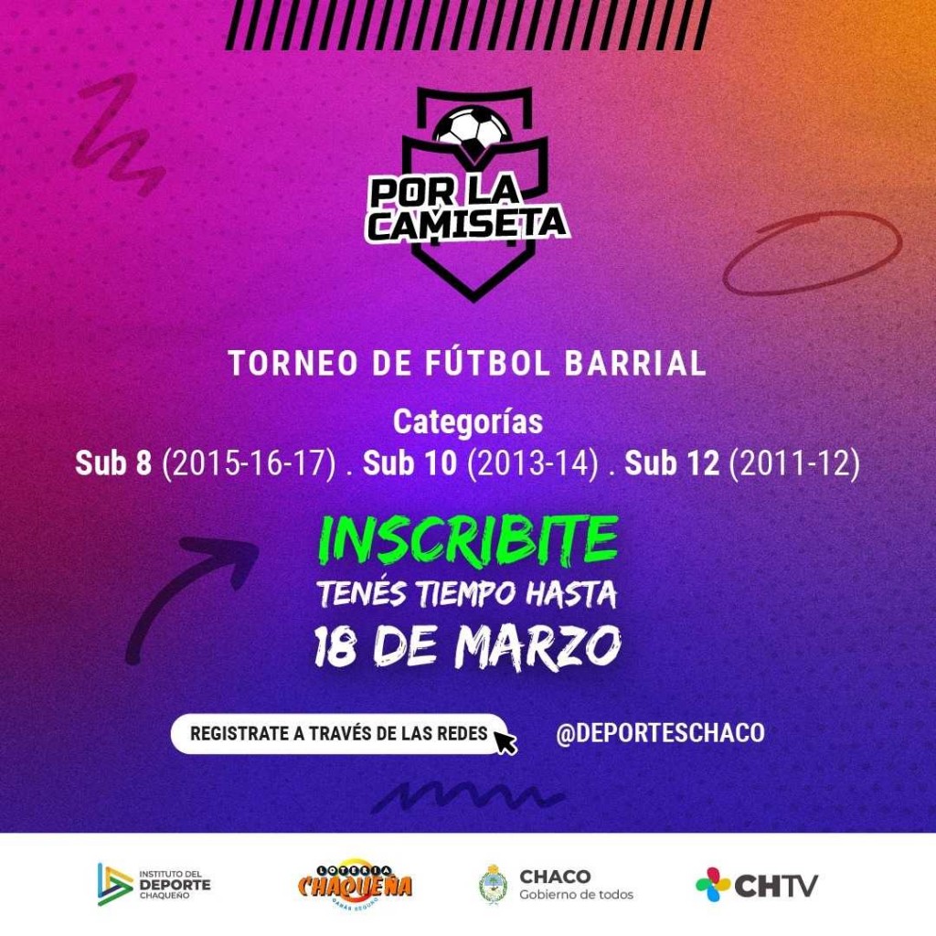 Este sábado finalizan las inscripciones al torneo de Fútbol Barrial "Por la camiseta" que organiza el Instituto del Deporte Chaqueño, junto a Lotería Chaqueña y Chaco Tv.