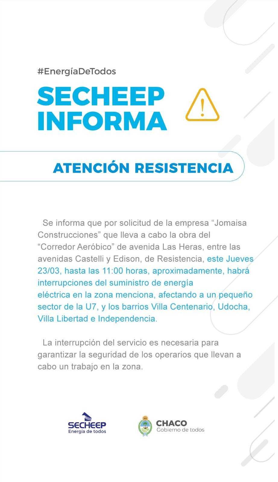 La empresa Secheep informó en un comunicado que “este jueves 23, hasta las 11:00 horas, aproximadamente, habrá interrupciones del suministro de energía eléctrica en la zona de avenida Las Heras, entre las avenidas Castelli y Edison, de Resistencia”. Además, podría afectar a un pequeño sector de la U7 y los barrios Villa Centenario, Udocha, Villa Libertad e Independencia”.