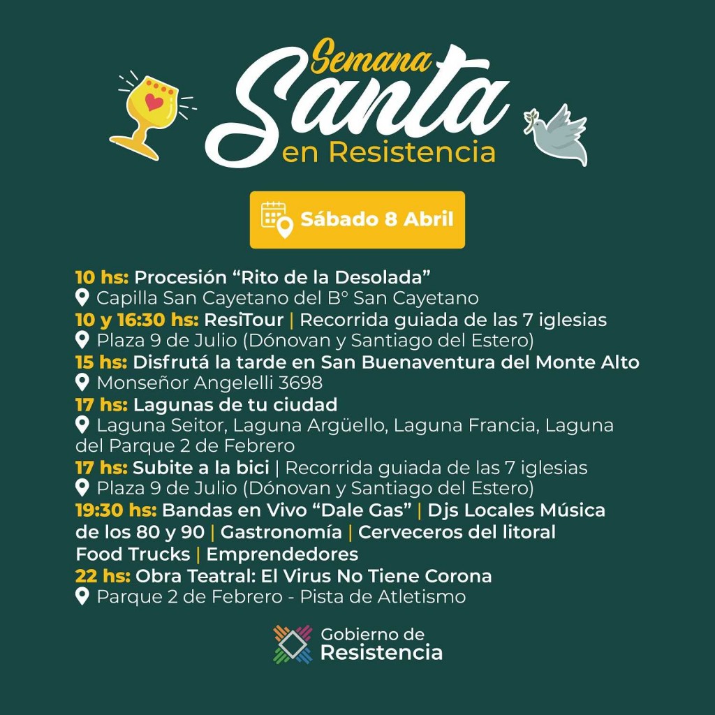 Para el sábado 8 de abril y en el marco del programa “Semana Santa en Resistencia”, una variada agenda habrá en la ciudad, con acceso libre y gratuito. A las 10, se desarrollará “Rito de la Desolada”, en la capilla San Cayetano del barrio homónimo, dando lugar a una procesión acompañando a la Virgen María hasta la sede de la Casa Garrahan Chaco.