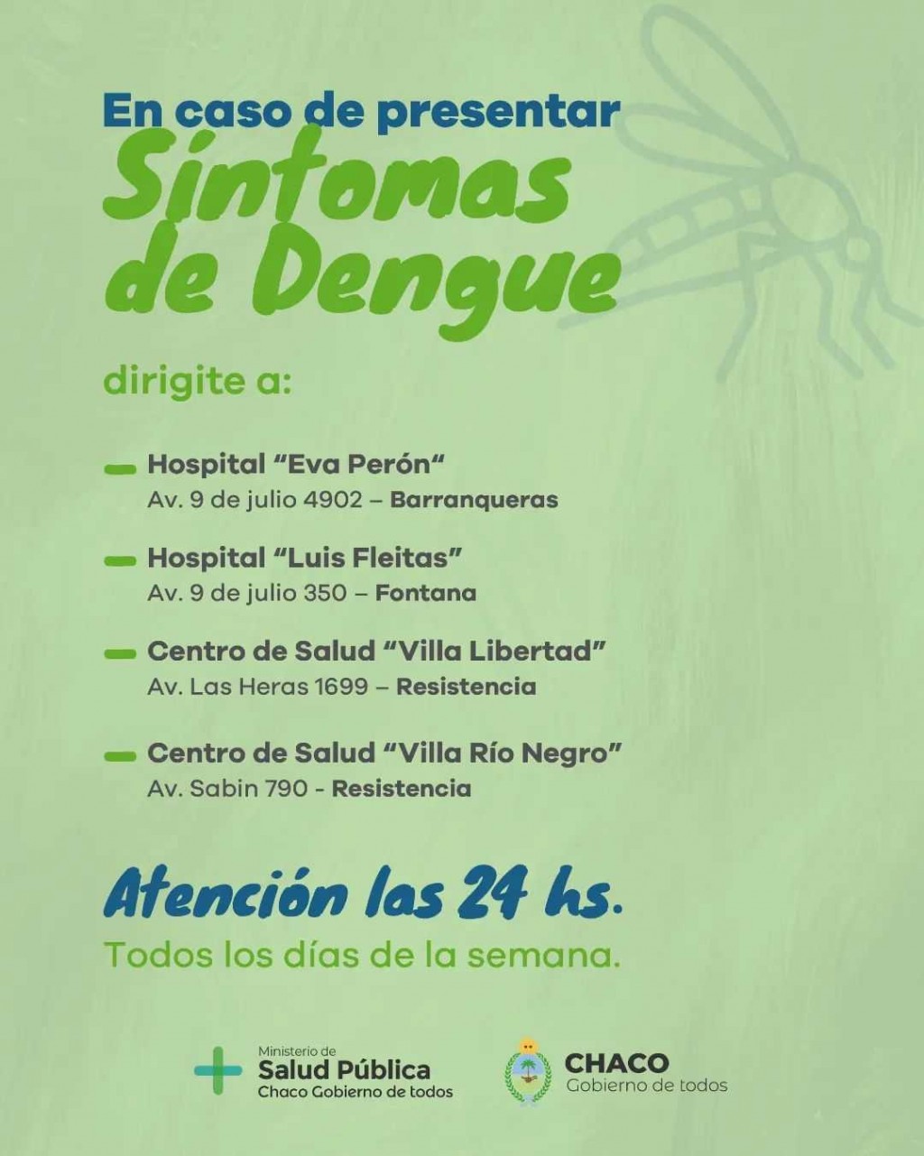 El Ministerio de Salud Pública del Chaco informa que, desde el 1 de enero de 2023 a la fecha, se notificaron en la provincia 9.400 casos positivos de dengue y 526 se encuentran en estudio. Con técnica de fumigación espacial se intervino en el Área Metropolitana del Gran Resistencia en la zona comprendida entre las siguientes calles y avenidas: Lavalle, B. Zorrilla, 25 de Mayo, Ávalos.