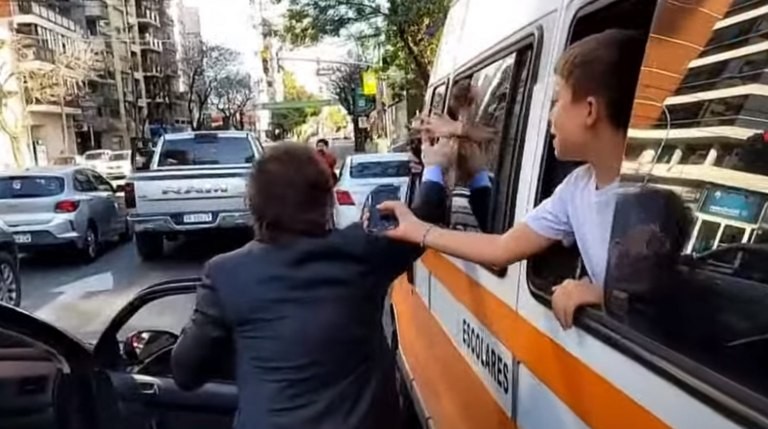 Rumbo a Olivos, Milei se bajó del auto para saludar a un micro escolar