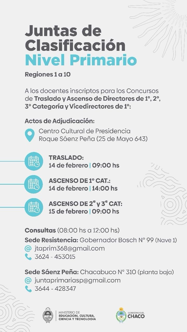 El Ministerio de Educación, a través de las Juntas de Clasificación Nivel Primario - Regiones 1 a 10, comunica a los docentes inscriptos para los Concursos de Traslado y Ascenso de Directores de 1ra., 2da., 3ra. Categoría y Vicedirectores de 1ra. que los actos de Adjudicación se realizarán en el Centro Cultural de Presidencia Roque Sáenz Peña, sito en 25 de Mayo 643 (calle 11, entre 14 y 16), en las fechas y horarios que a continuación se detallan: