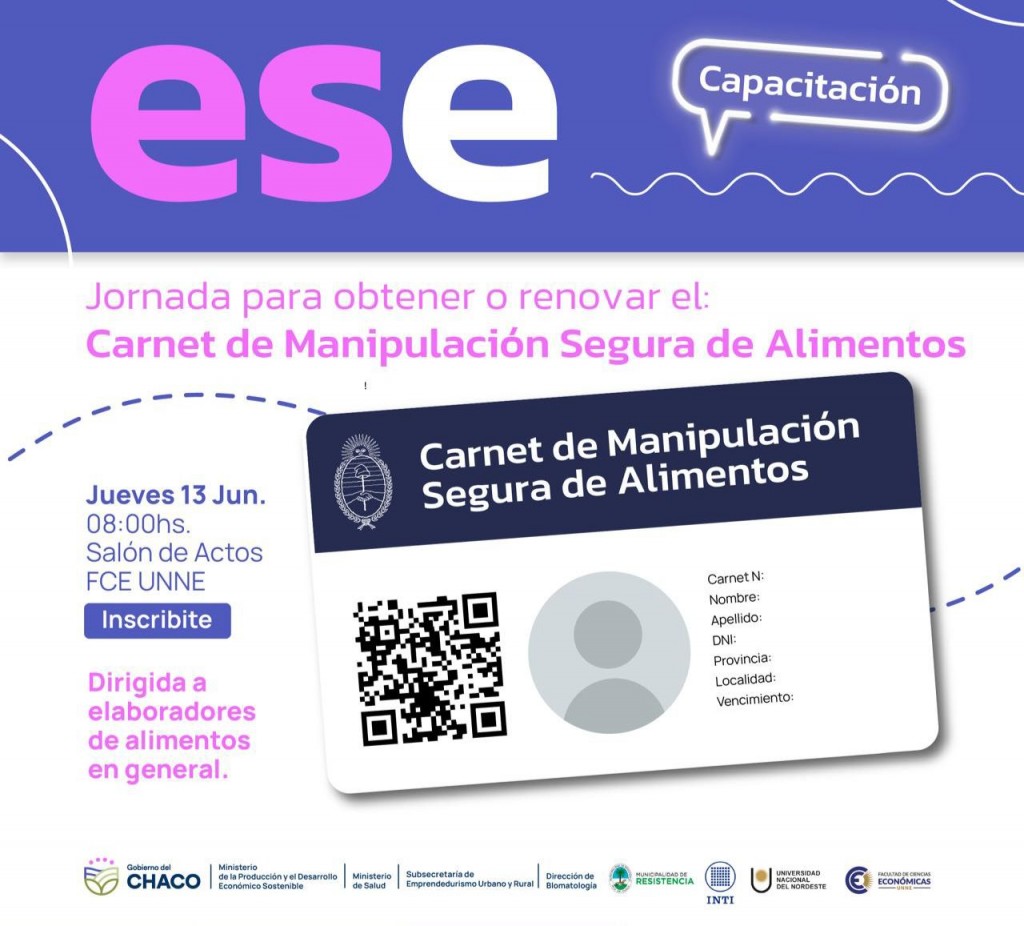 Este jueves 13 de junio, en el Salón de Actos de Facultad de Ciencias Económicas de la UNNE, se llevará a cabo el “Curso de Manipulación Segura de Alimentos", organizado por la Subsecretaría de Emprendedurismo Urbano y Rural del Ministerio de la Producción y el Desarrollo Económico Sostenible del Chaco, en colaboración con el INTI y la Universidad Nacional del Nordeste, además del acompañamiento de la Dirección de Bromatología de la provincia y del Municipio de Resistencia.