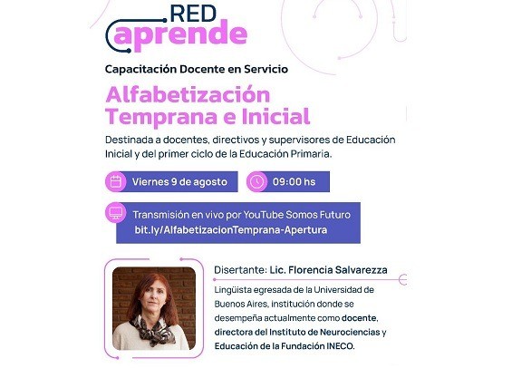Esta capacitación, destinada a docentes, directivos y supervisores de Educación Inicial y del primer ciclo de la Educación Primaria, estará a cargo de la doctora Florencia Salvarezza, lingüista egresada de la Universidad de Buenos Aires, institución donde se desempeña actualmente como docente, y directora del Instituto de Neurociencias y Educación de la Fundación INECO. En esta oportunidad, propone un programa de formación docente que cubre las áreas que determinan la lectura, sus modelos teóricos y la forma práctica en el aula, abordando los siguientes ejes: precursores de la alfabetización, enseñanza de las letras y sus sonidos, el principio alfabético, la práctica lectora en el aula desde el inicio del comienzo de la alfabetización, la práctica de la escritura en el aula desde el inicio del comienzo de la alfabetización, el trabajo del vocabulario; y la comprensión del lenguaje.