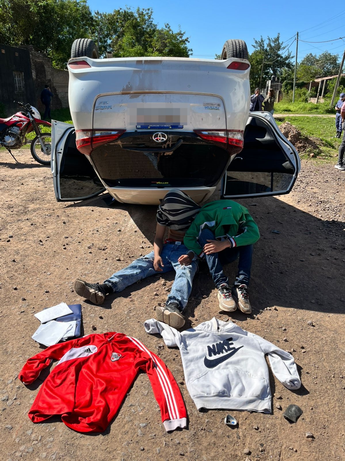 Dado un momento vuelca el vehículo en cuestión tras impactar con otro, luego del accidente comenzaron a salir varias personas del auto para intentar darse a la fuga pero tras no lograr su cometido fueron detenidos por los uniformados.