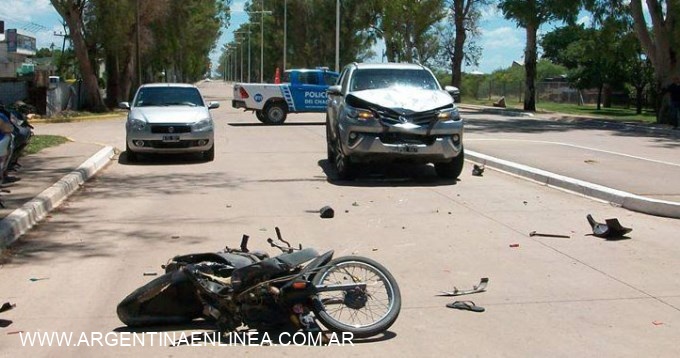 El vehículo oficial que trasladaba a la primera dama Emilse Nanoff Penoffa, esposa de Domingo Peppo gobernador de Chaco, y chocó a una moto en el acceso Norte de la ciudad de Villa Ángela. La camioneta que era conducida por la custodia embistió a la motocicleta en la que viajaban una pareja con un menor de un año y medio que resultó ilseo.