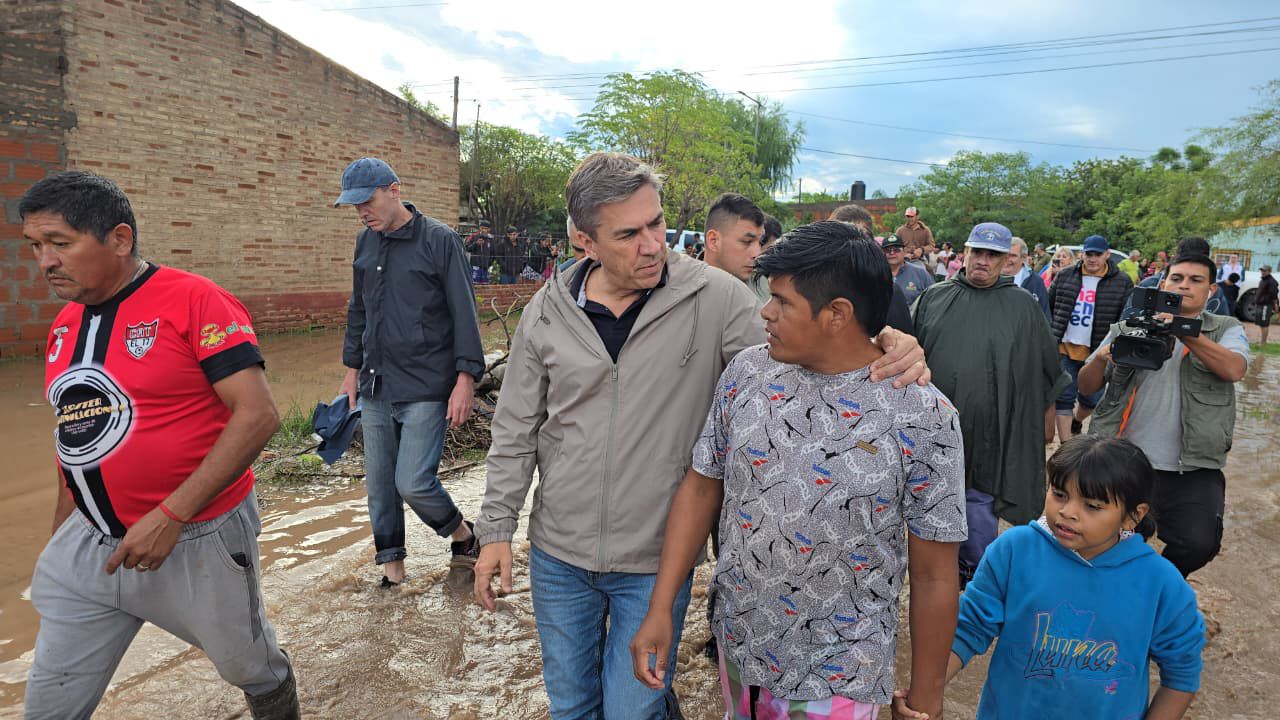 El mandatario provincial estuvo acompañado por ministros del gabinete y legisladores provinciales, en una recorrida por sectores anegados donde el agua mantiene aisladas a familias, complica la circulación y genera una situación crítica en distintos puntos de la localidad. “Estamos presentes en el lugar, acompañando a cada familia que hoy está atravesando un momento muy difícil. La prioridad es asistir, contener y dar respuestas concretas, luego continuamos hacia otras localidades”, expresó el gobernador.