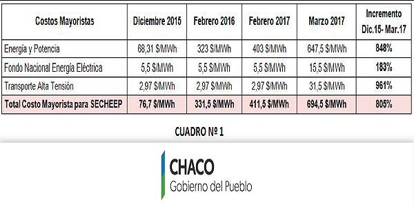 Cabe mencionar que a partir de febrero de 2016 hasta la fecha se han producido variaciones sustanciales en el precio de la energía mayorista, que el Ministerio de Energía de la Nación determina para las Distribuidoras Eléctricas Provinciales. Como ejemplo, se detallan los incrementos sufridos en los precios mayoristas para la empresa SECHEEP, siendo la variación media en el periodo del 805 por ciento (Ver Cuadro Nº 1).