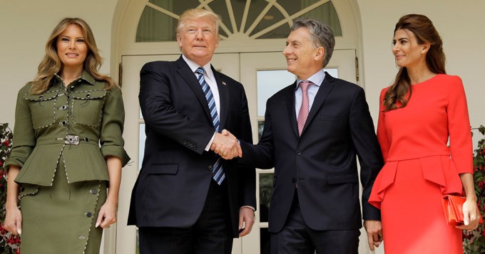Trump, junto a su esposa Melania, recibió a Macri, acompañado por la primera dama Juliana Awada, en el Pórtico de Ala Sur de la Casa Blanca. Ambos mandatarios se dirigieron al Salón de Recepción Diplomática, donde Macri firmó el Libro de Honor, y luego se trasladaron al Salón Oval para la reunión.