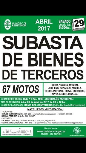 El municipio de Resistencia realizará mañana (29 de abril) la subasta pública de unos 67 motovehículos secuestrados en los últimos meses en distintos operativos de tránsito. La subasta se realizará en el Domo del Centenario a partir de las 8:30.