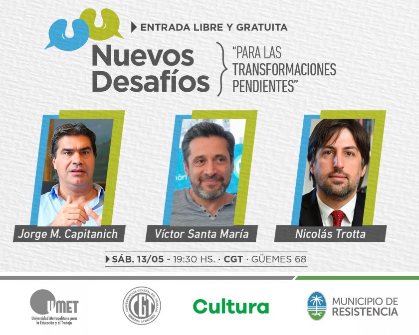 El ciclo de charlas y debates “Todas las Voces”, organizado por la Secretaría de Cultura, Turismo y Deporte del Municipio de Resistencia, continuará este sábado 13 desde las 19,30. En la sede de la CGT (Güemes 68), se realizará la charla “Nuevos desafíos para las transformaciones pendientes”, que tendrá como invitados al rector de la Universidad Metropolitana para la Educación y el Trabajo (UMET),