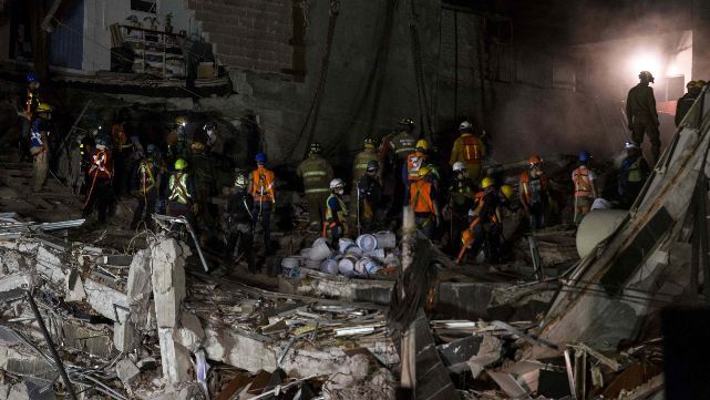 Rescatistas y perros especializados buscan a más sobrevivientes entre los restos de edificios.