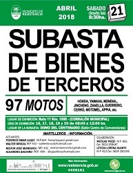El próximo sábado 21, desde las 8.30, en el Centro de Convenciones del Domo del Centenario, el Municipio de Resistencia realizará la gran subasta de motocicletas que incluirá a 97 unidades en buen estado modelos 2000 a 2015). Desde el 16 de abril, de 8 a 12, los interesados pueden acercarse al corralón Municipal (ruta 11, km 1006) a constatar las condiciones de las unidades.